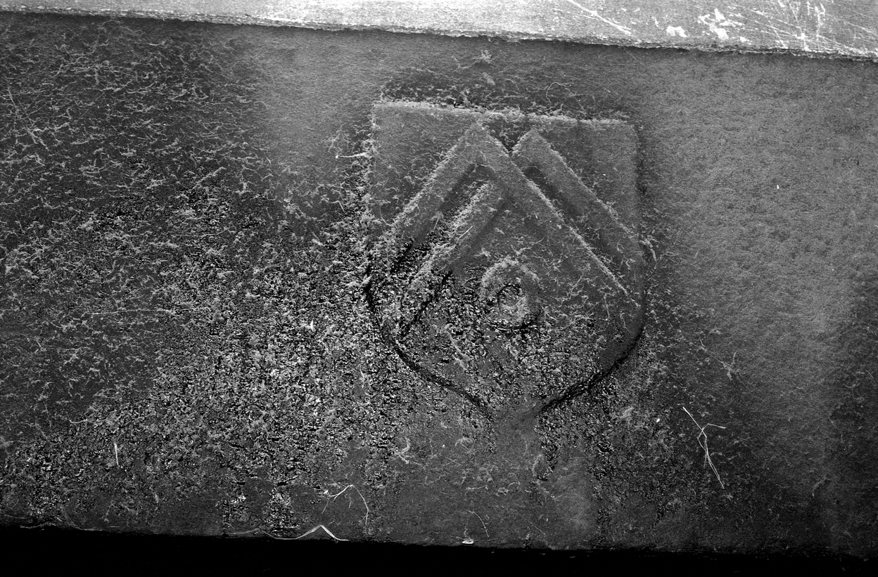 Minihy-Tréguier, Crec'h an Goué : dépendance à usage de porcherie, détail d'une cheminée armoriée, photographie de 1973. Ces armoiries, identifiées comme celles de la famille Pavic, sont : "d'azur à deux chevrons entrelacés de sable, accompagné en pointe d'un annelet de même"Immatriculation