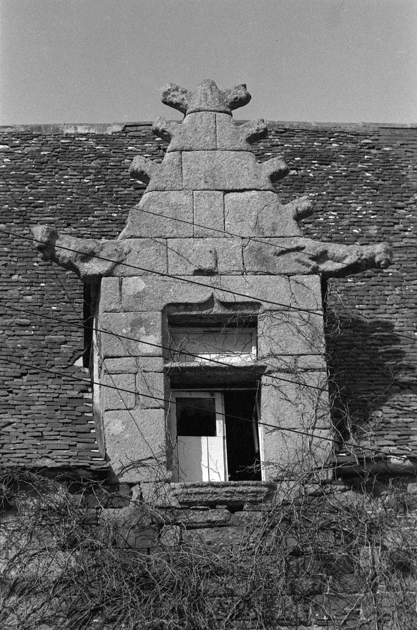 Minihy-Tréguier : manoir de Saint-Renaud, façade sud, détail de la lucarne à gable aigu de style gothique flanquée de crossettes sculptées, photographie de 1973Immatriculation