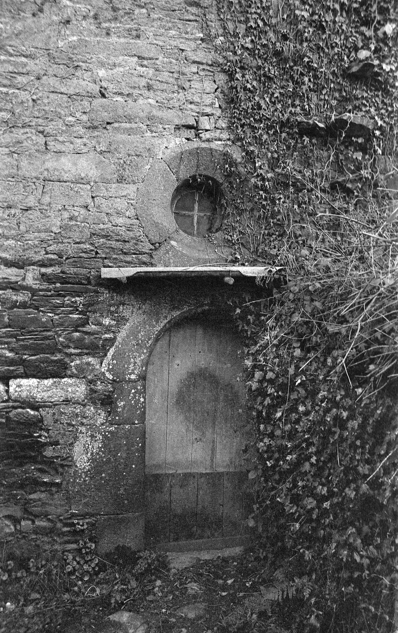 Minihy-Tréguier : manoir de Saint-Renaud, élévation nord, porte en arc plein cintre surmontée d'un oculus, photographie de 1973Immatriculation