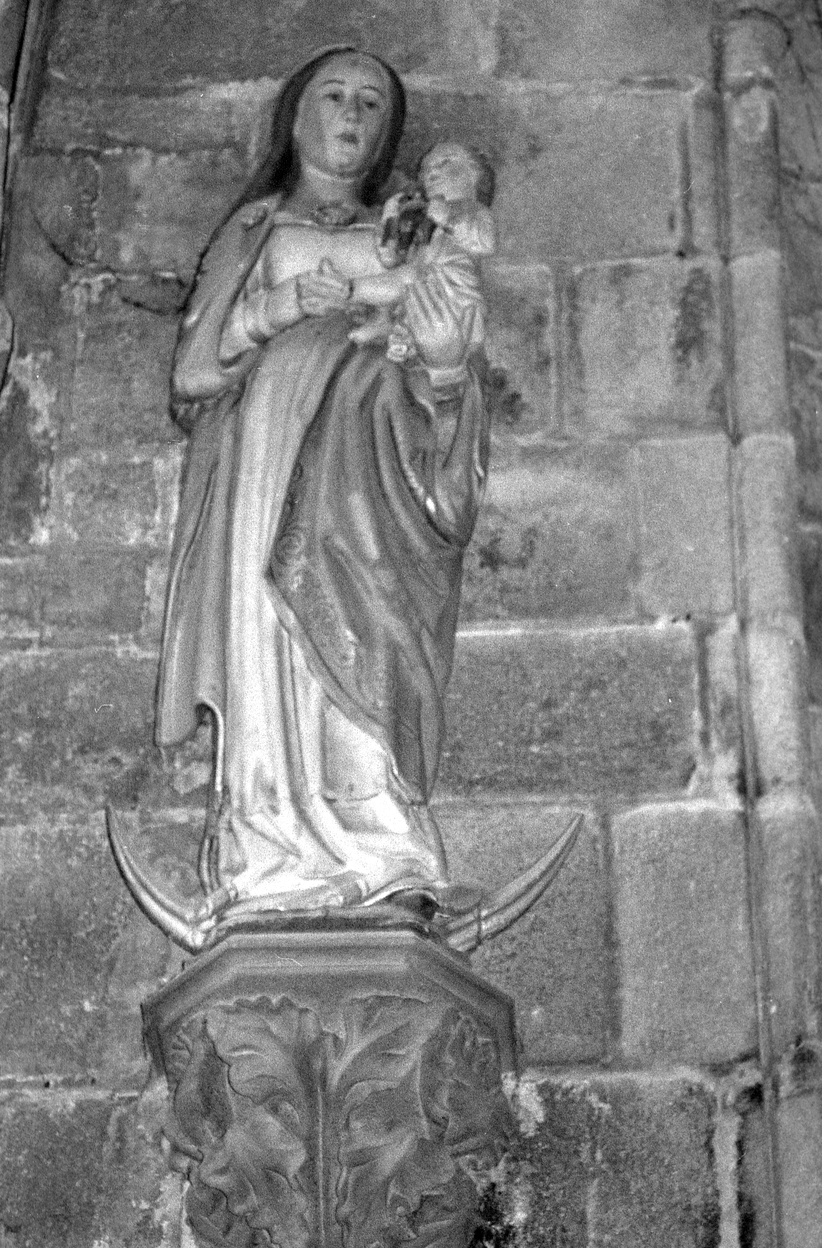 Minihy-Tréguier, rue de l'Église : église Saint-Yves, détail de la statuaire, Vierge à l'enfant, photographie de 1973Immatriculation