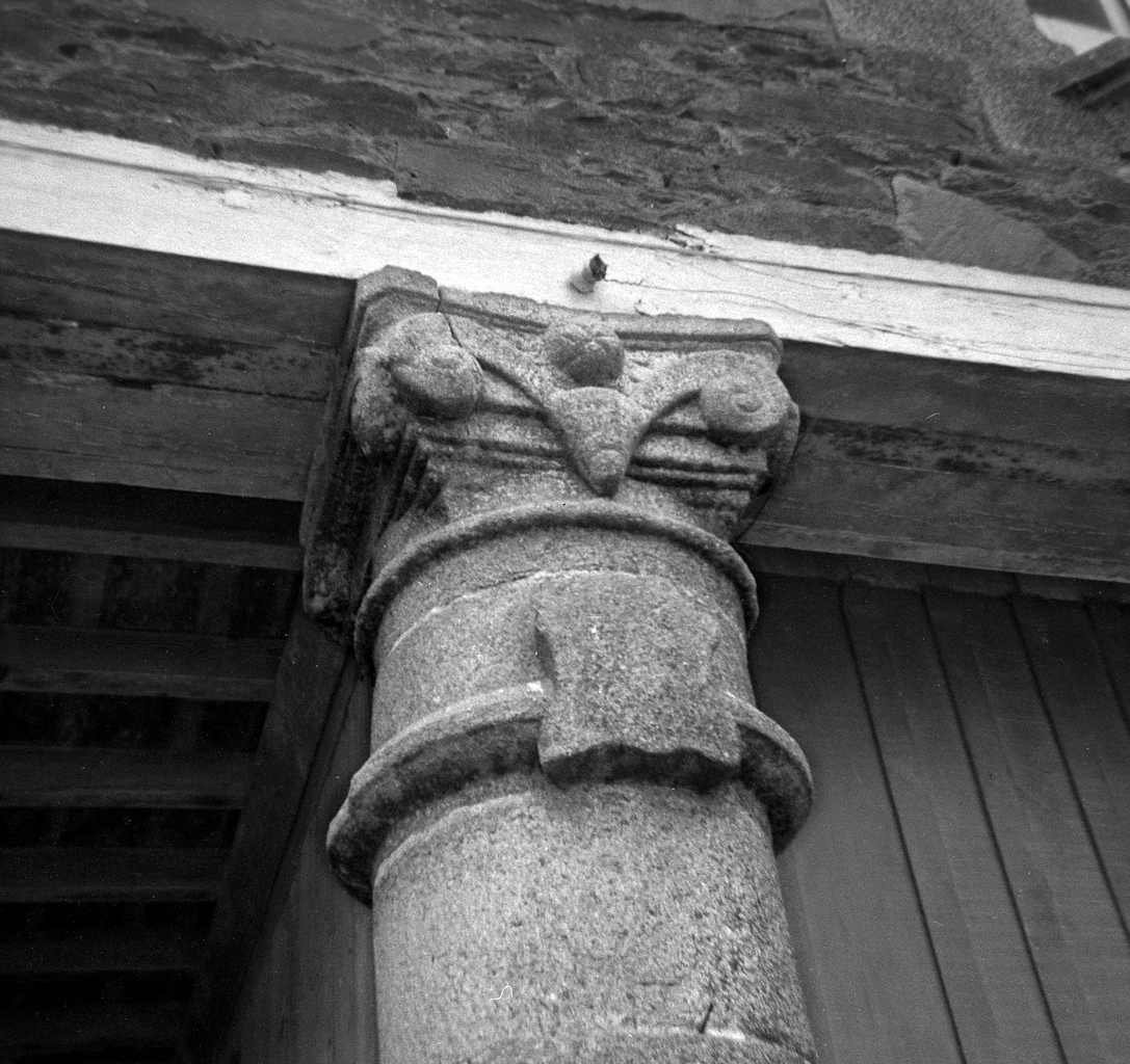 Aile nord en retour d'équerre, élévation est, galerie servant de remise, détail de l'un des colonnes aux chapiteaux sculptés (les armoiries restent muettes), photographie de 1973Immatriculation
