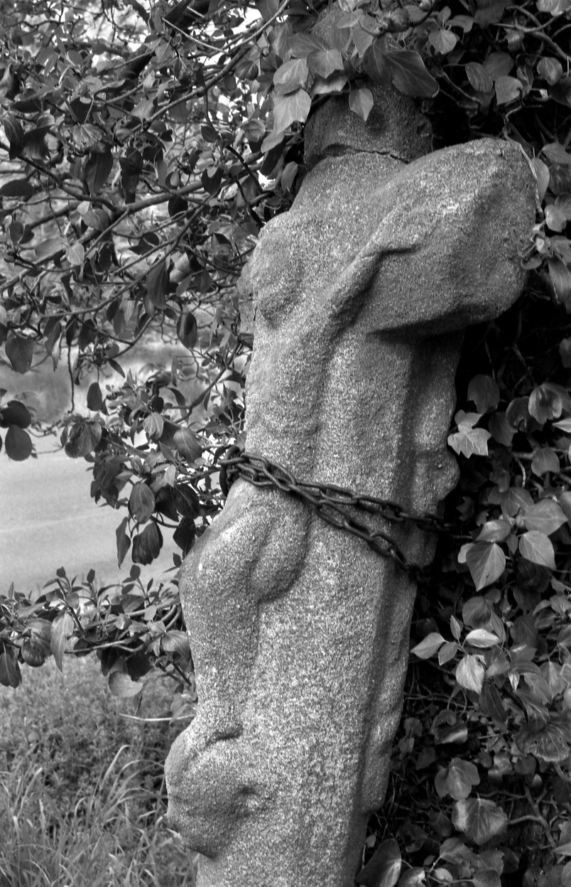 Minihy-Tréguier : croix de Kerguyomard, face ouest, Christ en croix (au revers, Vierge à l'enfant), photographie de 1973. Cette croix a depuis été déplacée à LangazouImmatriculation