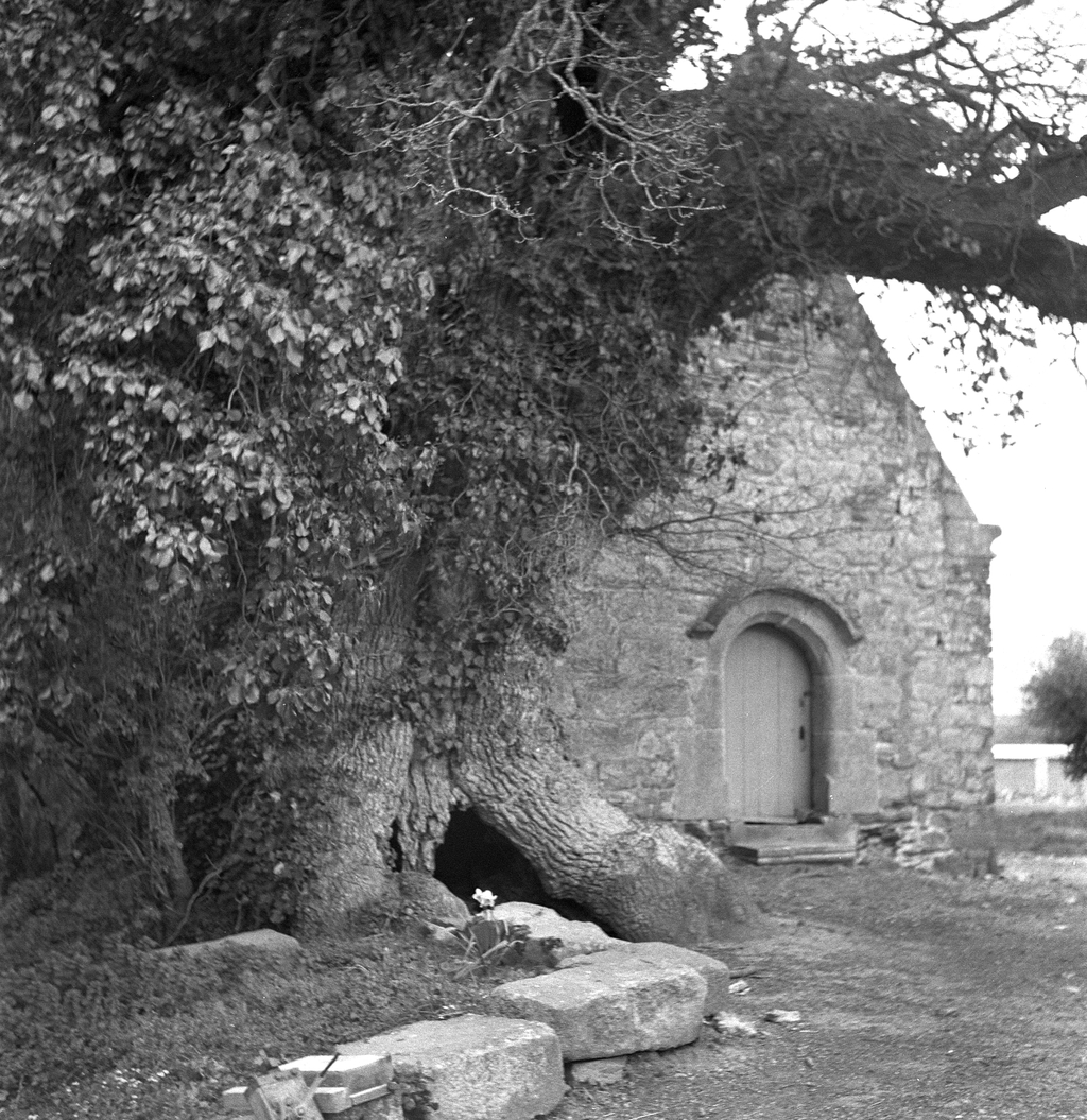 Vue générale de la chapelle depuis l'ouest, photographie de 1973. Au premier plan, un chêne quasi millénaireImmatriculation