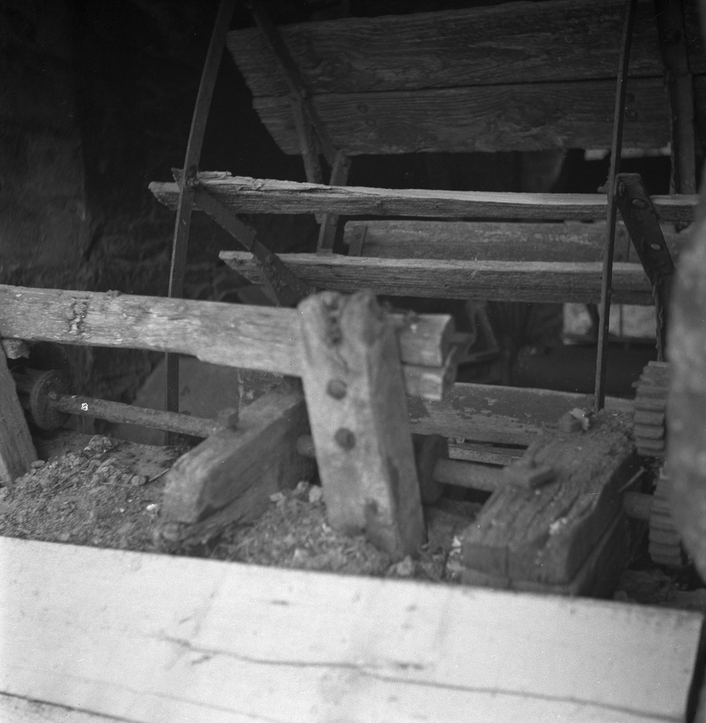 Minihy-Tréguier, le Guindy : moulin de Keraliou surnommé "moulin Le Bourva" en référence au propriétaire, détail de la roue à aubes, photographie de 1973Immatriculation