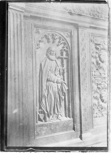 Lambris du choeur (disparu), détail d'un panneau. Repro.Immatriculation