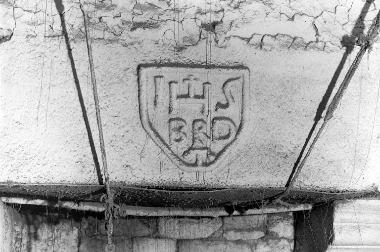 La Herblinais - Maison, cheminée de la porcherie, vue de détail de l'écusson.Immatriculation