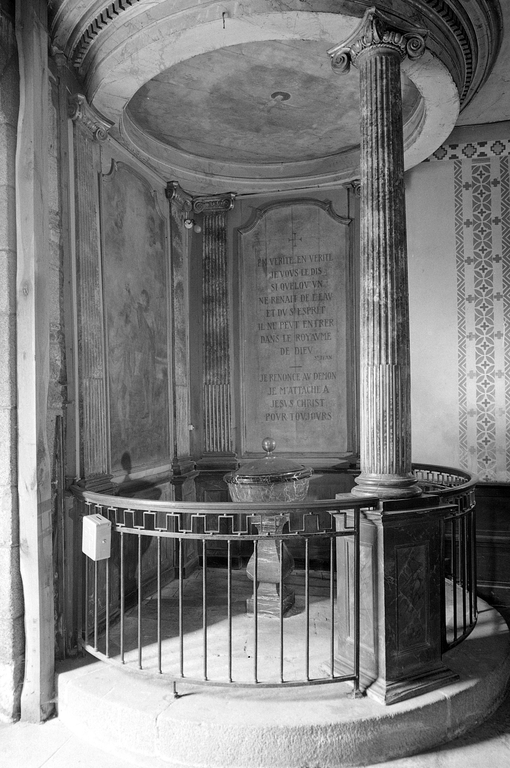Fonts baptismaux, baldaquin des fonts baptismaux, clôture des fonts baptismaux (Lécousse),