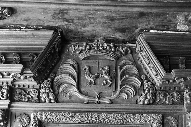 Lambris de cheminée du salon, couronnement, vue de détail.Immatriculation