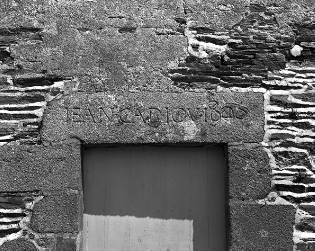 Détail : inscriptions sur le linteau de porte d'entrée, façade sud (cliché 1973)Immatriculation