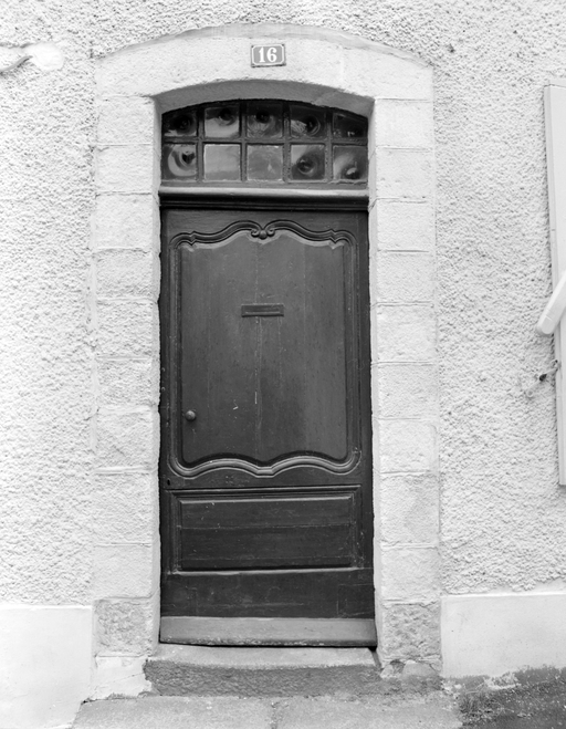 Détail menuiserie de la porte d'entrée, vue générale (vantail et imposte)Immatriculation