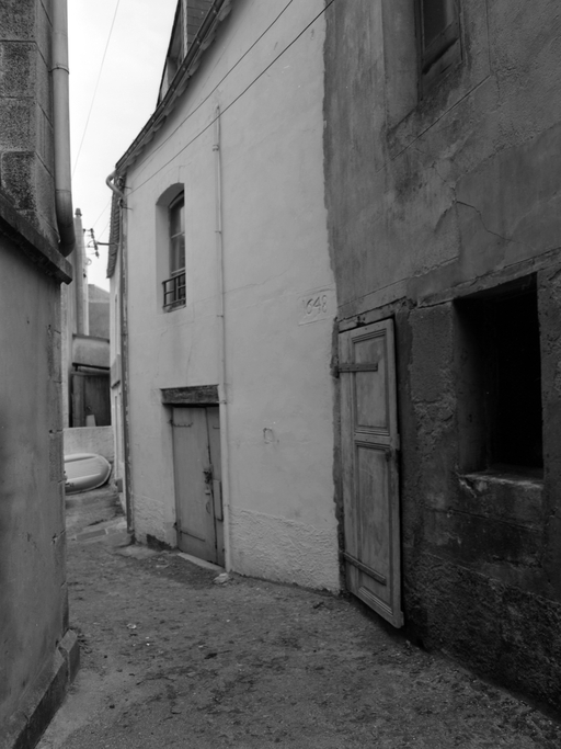 Vue de l'élévation sur ruelle entre maison et église avec la date 1648Immatriculation