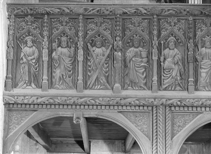 Plounévez-Moëdec, le bourg : église paroissiale Saint-Pierre, vue intérieure, détail des panneaux de la galerieImmatriculation
