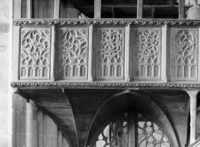 Restes du Jubé bas-côté sud du choeur - Face est, tribune, détail des trois panneaux nord.Immatriculation