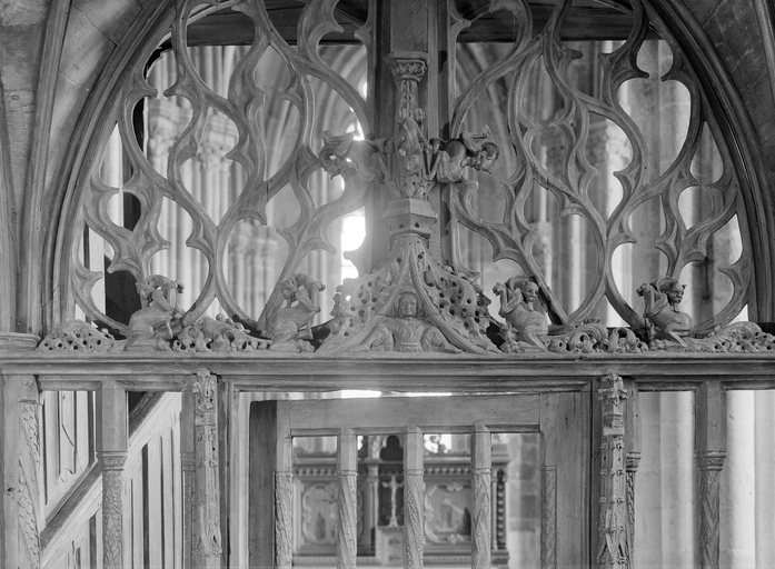 Restes du Jubé bas-côté sud du choeur - Face ouest, détail du fleuron de l'archivolte de la porte (diables).Immatriculation