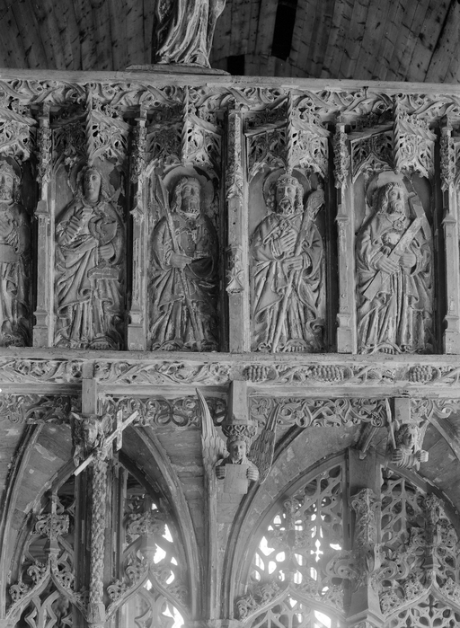 Ploubezre : chapelle de Kerfons, vue de détail du jubé, galerie des apôtres, 4 panneaux, côté nordImmatriculation