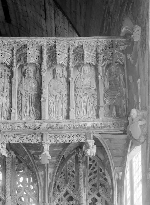 Ploubezre : chapelle de Kerfons, vue de détail du jubé, galerie des apôtres, extrémité sudImmatriculation