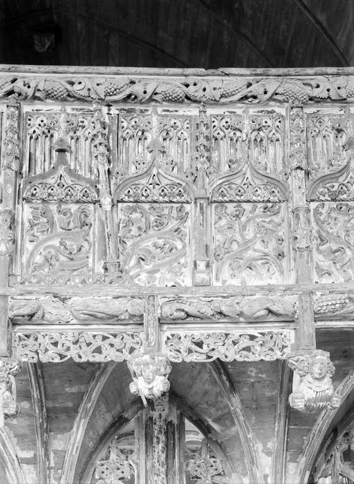 Ploubezre : chapelle de Kerfons, vue de détail du jubé, panneaux de la face estImmatriculation