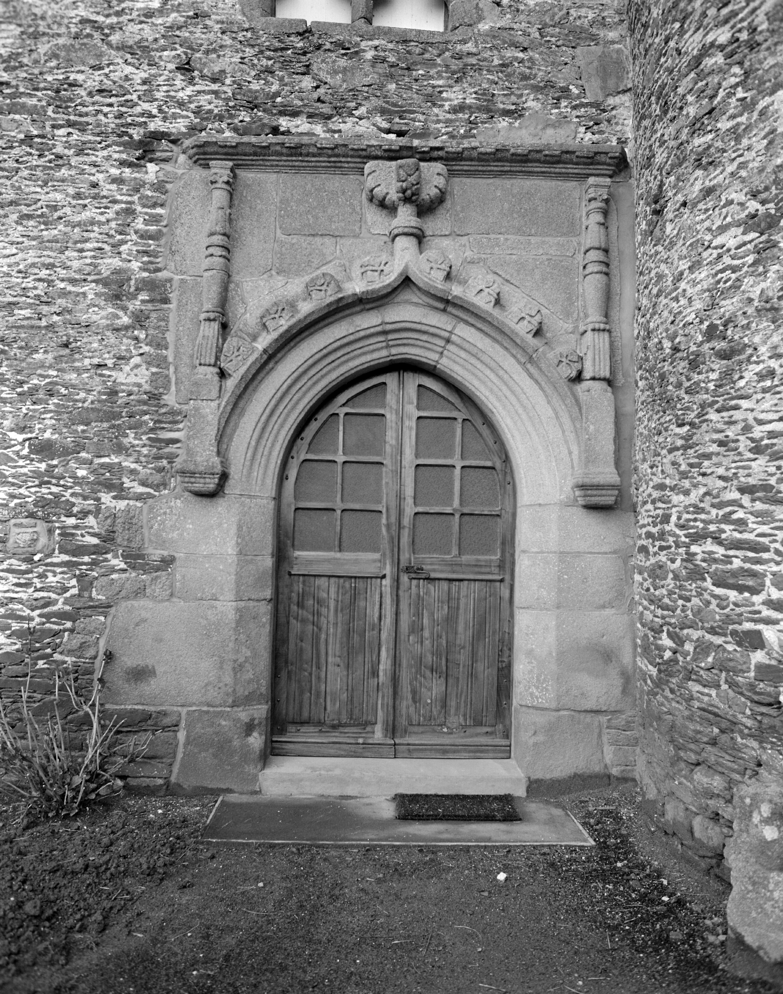 Détail de l'élévation nord, porte principale, photographie de 1974. Réalisée en pierre de taille de granite, cette porte en arc brisé et à large chanfrein est surmontée d’une archivolte ornée d’une accolade (arborant un décor de feuilles denticulées) et surmontée d’un fleuron, servant de base à des pinacles aux motifs renaissant faisant pilastre. Un larmier orné de modillon protège l’archivolteImmatriculation
