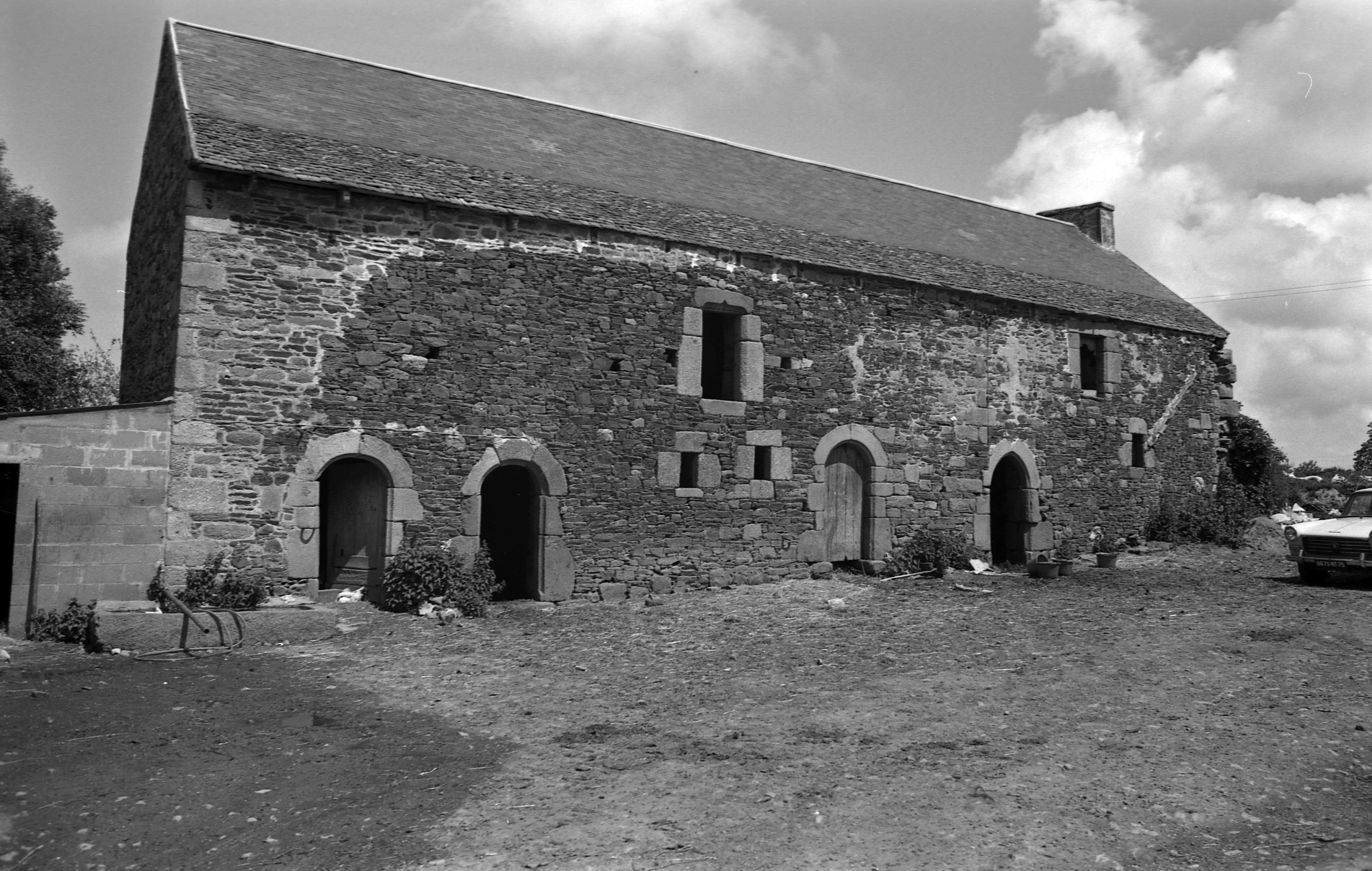 Plouzélambre : manoir de Kervégan, bâtiment B détruit, élévation sud, photographie de 1974. On retouve des éléments du 16e et du 17e siècles : porte en arc brisé, portes en arc plein cintre, fenêtres à accolade...Immatriculation