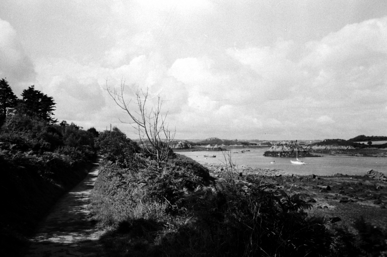 Bréhat, paysage. Vue du Kerpont, de la pointe sud de Beniguet et de l'île de Raguénès depuis la route menant à l'abri du canot de sauvetage du Goareva (cliché Sylvaine Laffiché, pré-inventaire, 1975)Immatriculation
