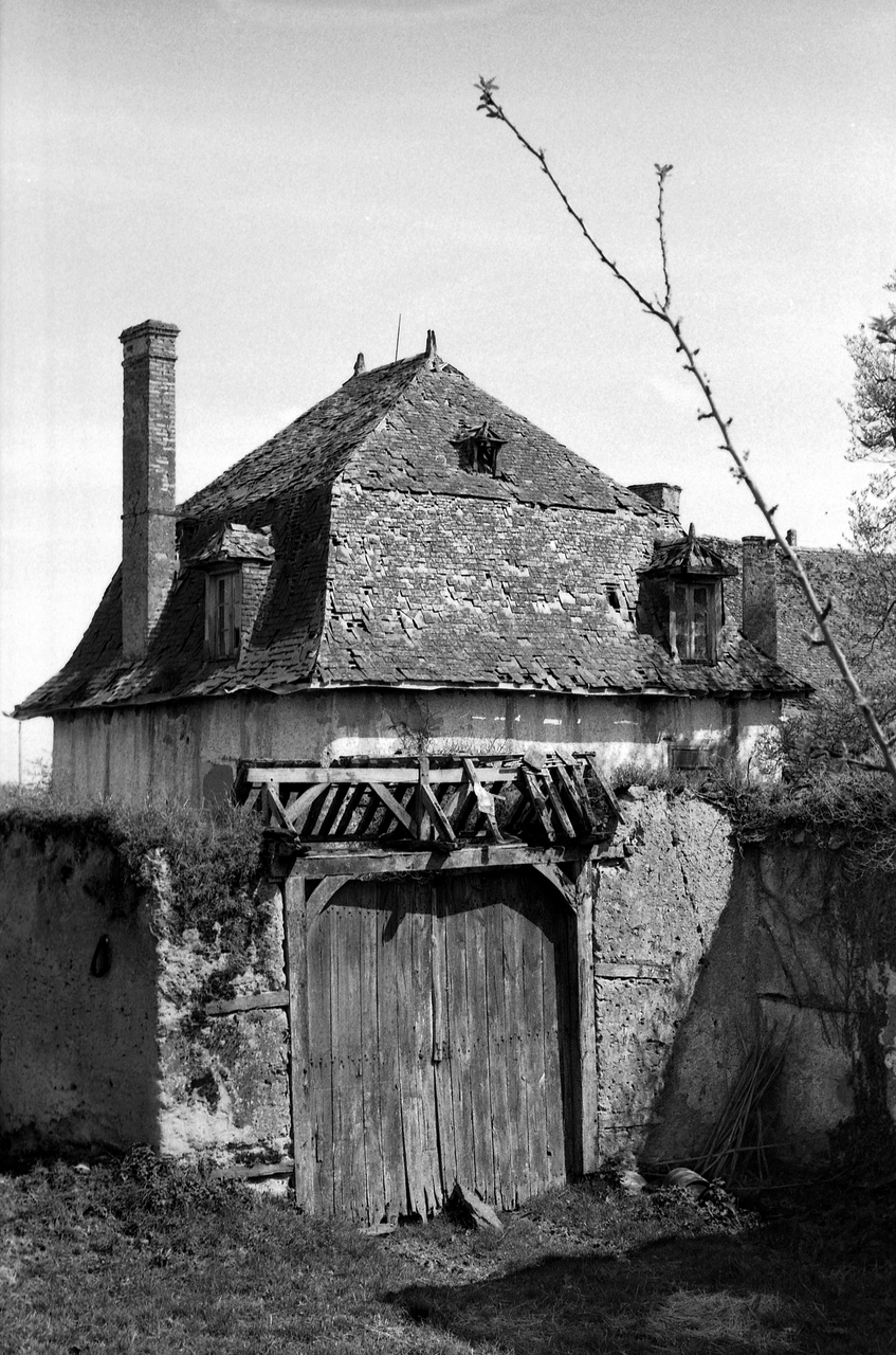 Manoir de Cherville, porche postérieur percé dans le mur d'enclos et vue postérieure de la toiture du pavillonImmatriculation