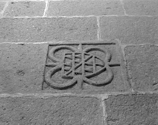 Nef, près de la troisième colonne sud : pierre armoriée dans le pavageImmatriculation
