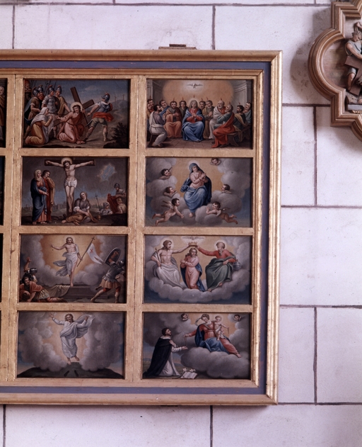 Détail de huit panneaux : Portement de croix, Pentecôte, Crucifixion, Résurrection, Ascension, Assomption, Couronnement, Rosaire.Immatriculation