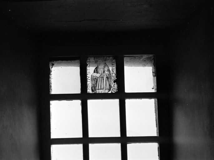 Fragment de vitrail, baie sud : personnage avec couronne d'orfèvrerie tenant un livre ouvert dans sa main droite et une épée dans sa main gauche (cliché Guy Artur, pré-inventaire, 1977)Immatriculation