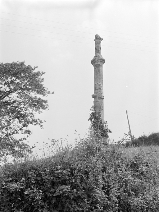 Croix du Vossec. Vue générale de la face sud-ouest envahit par la végétation. Croisillon brisé. Etat en 1977.Immatriculation