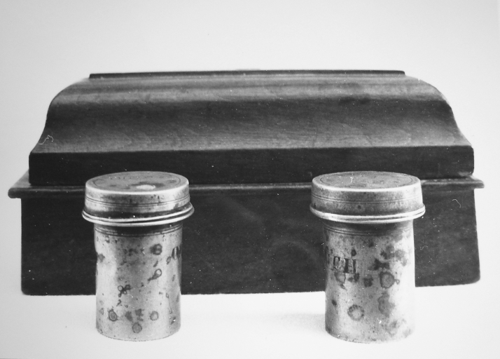 Boîte aux saintes huiles : vue générale du coffret et des ampoulesImmatriculation