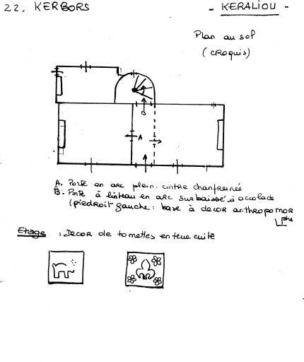 Plan au sol du manoir de Keraliou et relevé du décor des tomettes en terre cuite à l'étage d'après croquis (pré-inventaire, avril 1977)Immatriculation