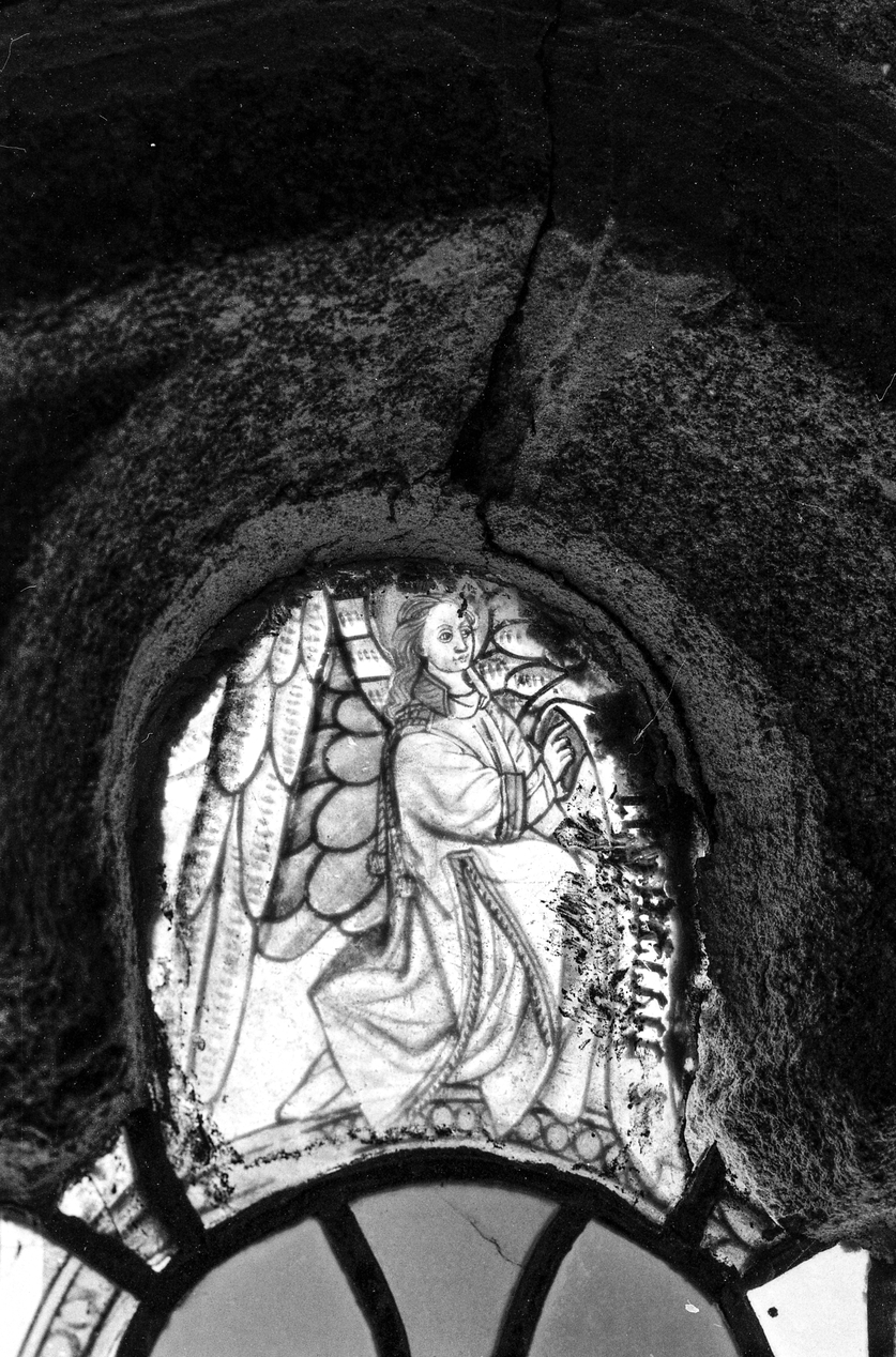 Fragments de vitraux anciens représentant l'archange Gabriel dans une scène de l'Annonciation près du choeur (état en 1977)Immatriculation