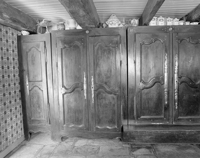 Mur nord, front des armoires 3 (côté gauche) : armoires, "bank koste'n ti" et rangée de bols sur les corniches. (1977)Immatriculation