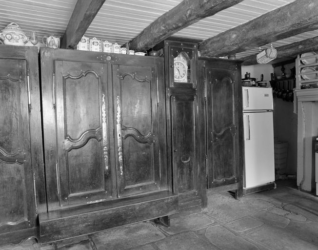 Mur nord, front des armoires 3 (côté droit) : armoires, horloge, "bank koste'n ti" et rangée de bols sur les corniches. (le lit clos près du feu a été remplacé par un réfrigirateur) (1977)Immatriculation