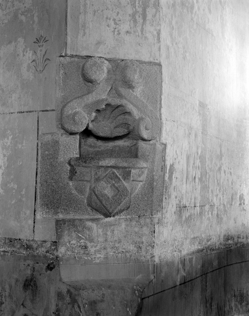 Croisée du transept, bénitier aux armes des Treanna. (1977)Immatriculation