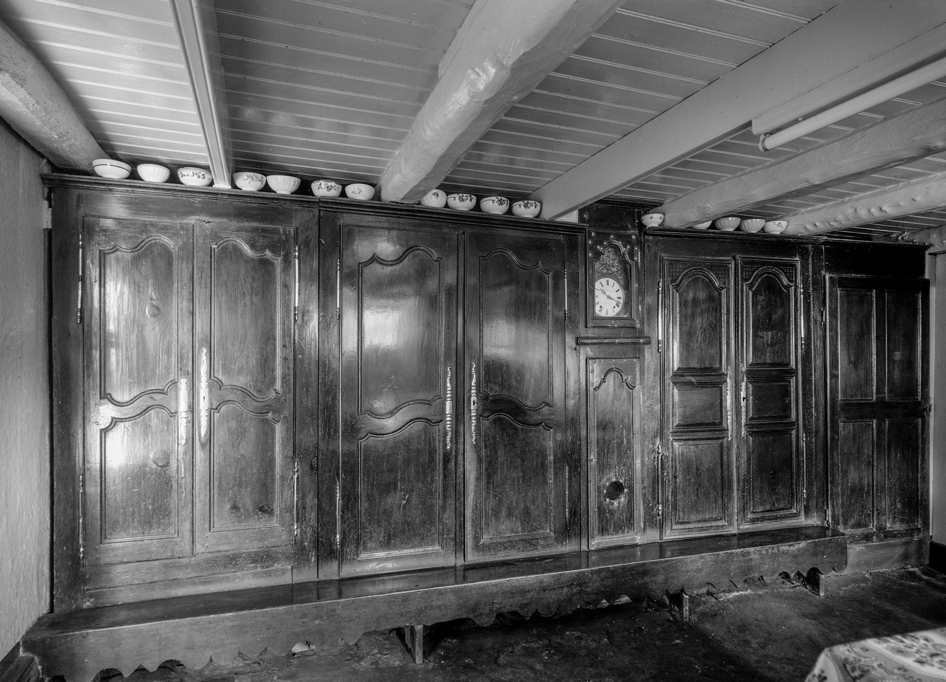Mur nord, front des armoires 1 : armoires, horloge, "bank koste'n ti" et rangée de bols sur les corniches. (1977)Immatriculation