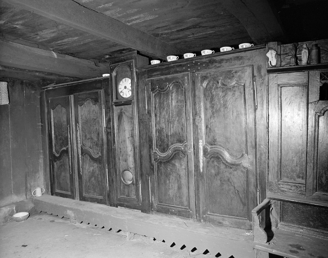 Mur nord, front des armoires 2 (côté gauche) : armoires, horloge, "bank koste'n ti" et rangée de bols sur les corniches. (1977)Immatriculation