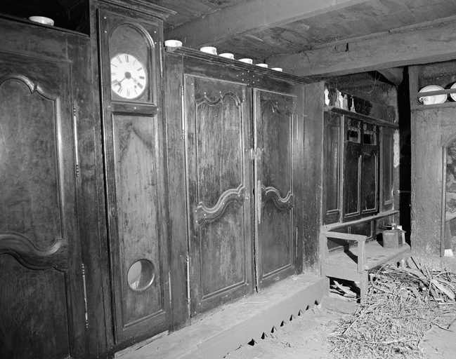 Mur nord, front des armoires 2 (côté droit) : armoires, horloge, lit-clos près du feu, "bank koste'n ti" et rangée de bols sur les corniches. (1977)Immatriculation