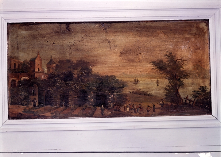 Tableau paysans sur la berge.Immatriculation