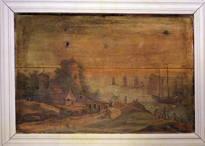 Paysage côtier avec pêcheurs, au-dessus du placard de droite du mur opposé à la cheminéeImmatriculation