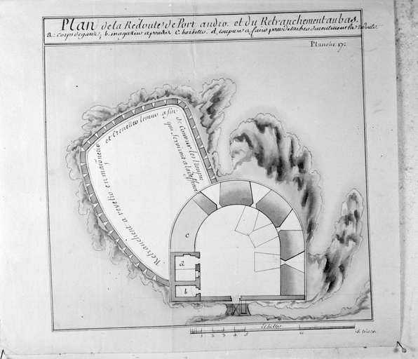 Plan de la redoute de port andro et du retranchement en bas, aquarellé accompagnant l'Etat... de De Taille, 1780Immatriculation