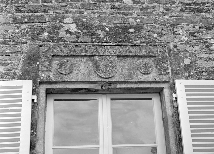 Elévation nord, linteau de la fenêtre ouest (1er niveau).Immatriculation