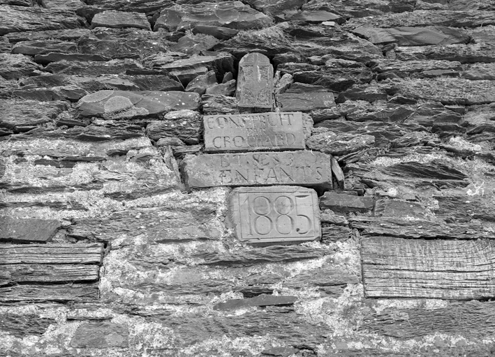 Le Plessis-Arraud : pierre portant la date 1885 et l'inscription : 'construit par Crochard et ses enfants'Immatriculation
