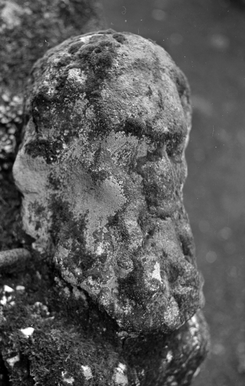 Fragment de tête d'apôtre remployé dans l'escalier de la cour au sud du chevetImmatriculation