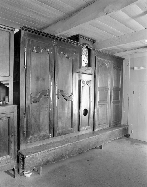 Mur nord, front des armoires 9 : armoires, horloge et "bank koste'n ti". (1978)Immatriculation