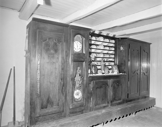 Mur nord, front des armoires 2 : armoires, horloge, buffet vaisselier et "bank koste'n ti". (1977)Immatriculation