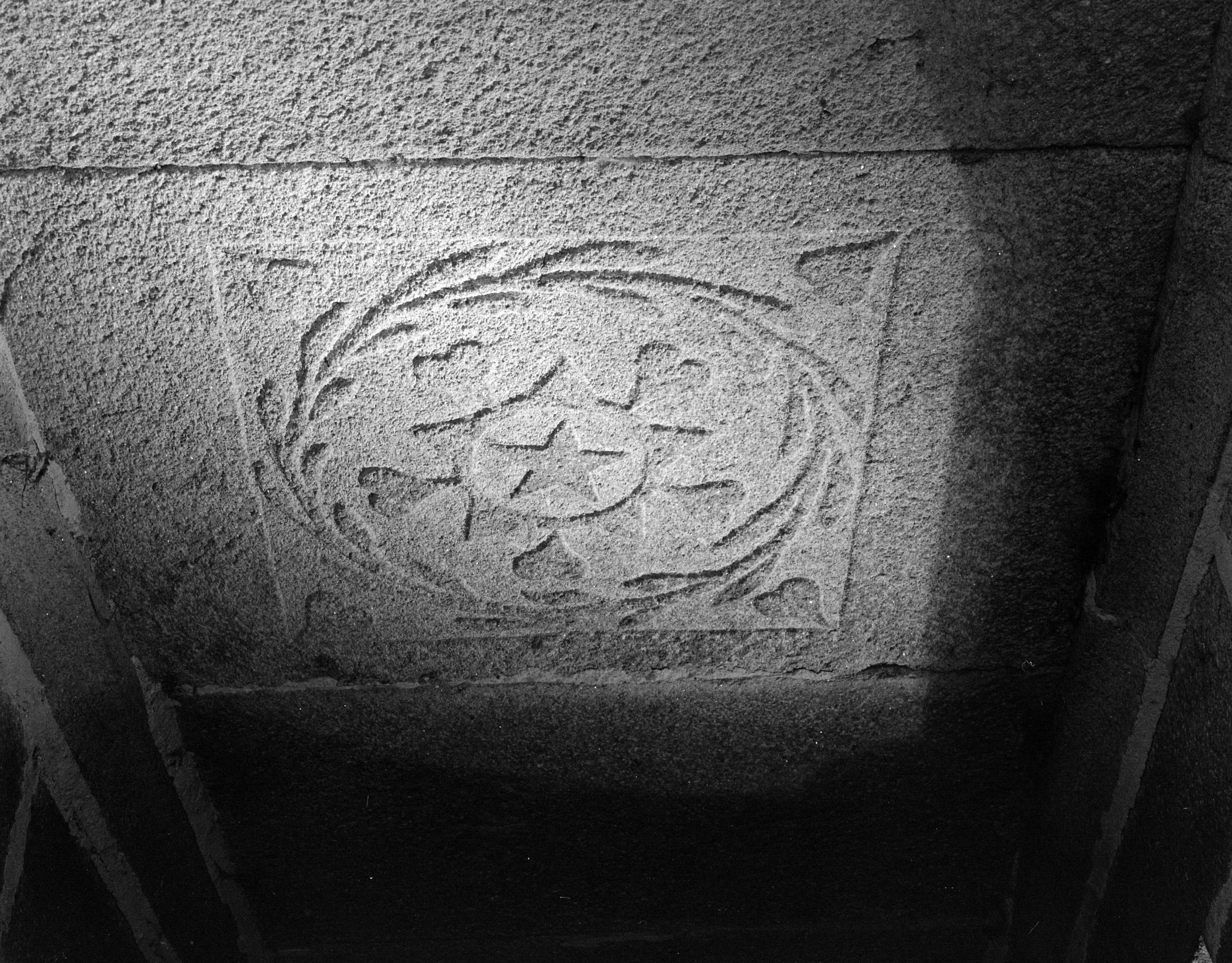Couloir du logis, décor sculpté : motif ornemental central sur une dalle du plafond. (1978)Immatriculation