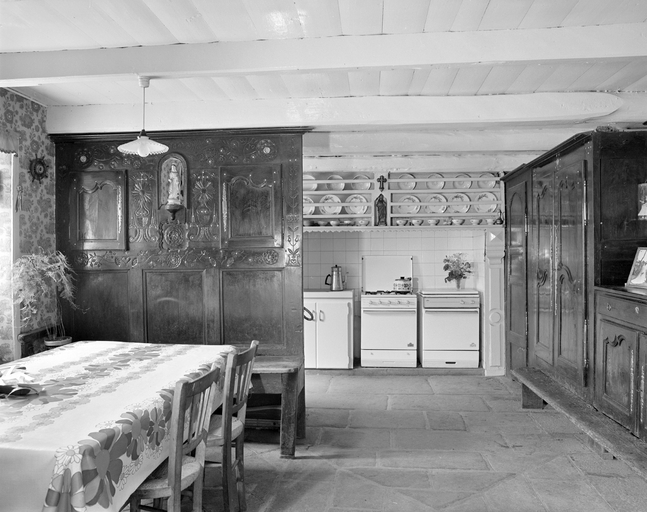 Salle commune 1, vue générale vers l'ouest. Mur nord : front des armoires (armoires, buffet-vaisselier et "bank Koste'n ti"). Mur sud : drustuilh en place et table à manger. Pignon ouest : vaisselier au-dessus de la cheminée remaniée. (1978)Immatriculation