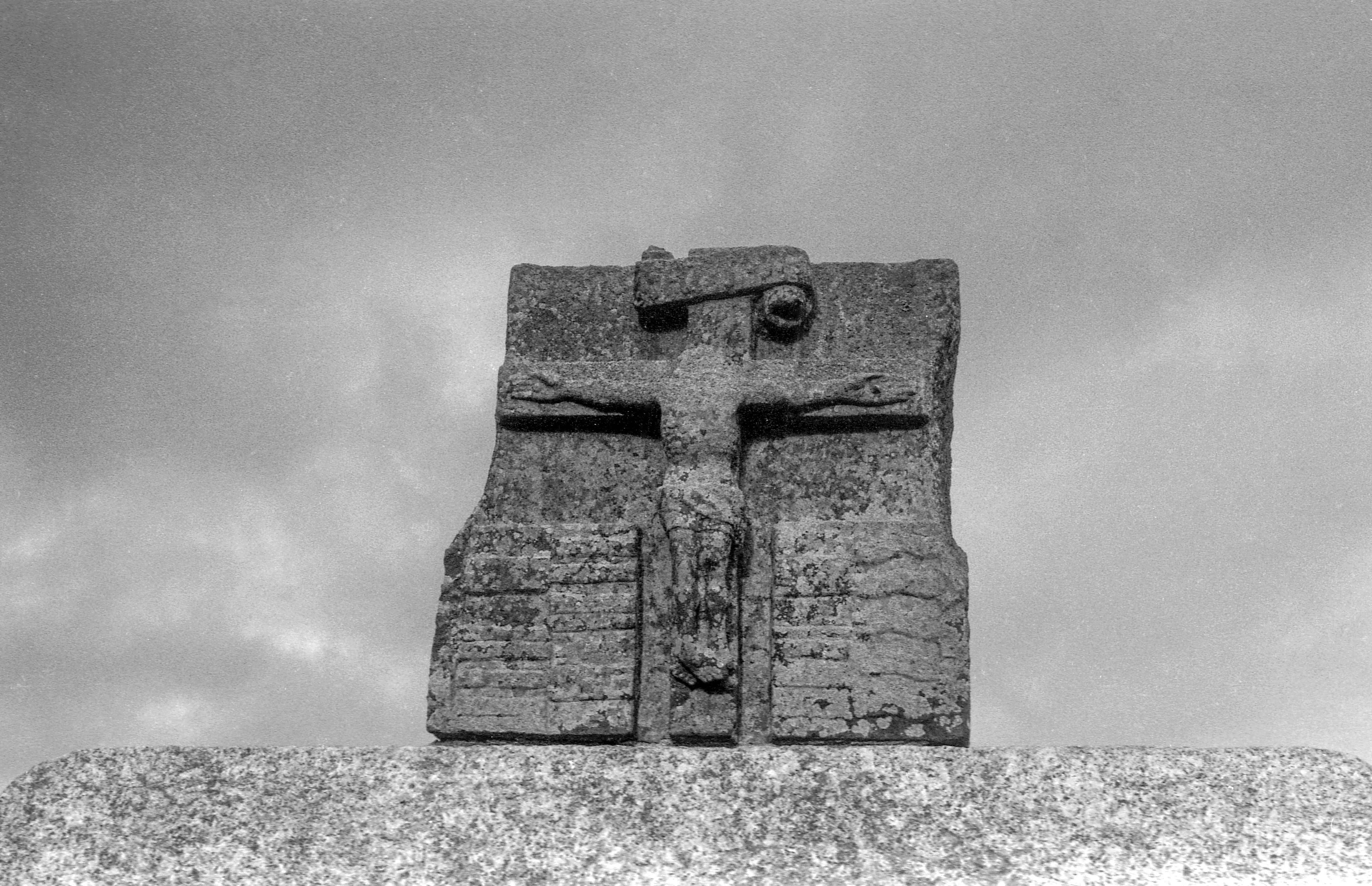 Fontaine de dévotion : remploi (?) d'une pierre de kersantite portant un Christ en croix encadré de blasons (état en 1978)Immatriculation