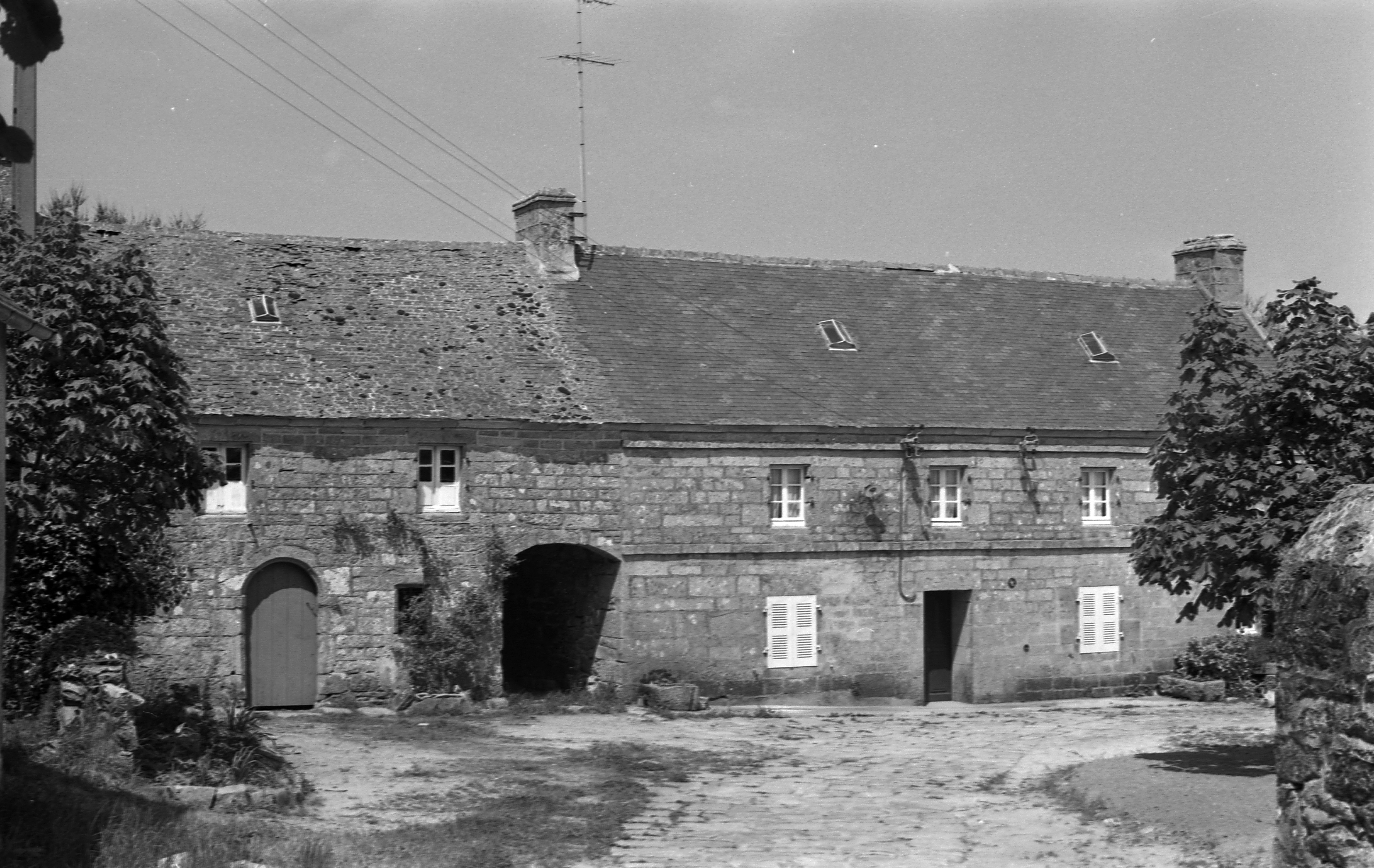 Elévation antérieure de l'alignement principal : logis et ty scol datés tous deux de 1790. (1978)Immatriculation